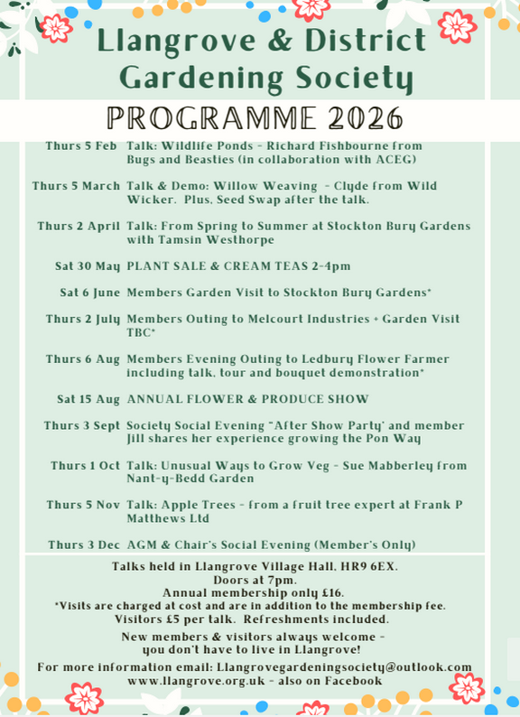 or search Facebook for Llangrove & District Gardening Society.